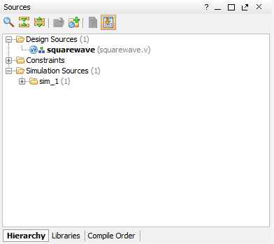Press “Alt+A” key combination. This will bring up “Add Sources” window. Choose “Add or create design sources” and click “Next”. In the next step, click “Create File” and enter in the name of the file as “squarewave.v”. Click “OK” and then “Finish”.