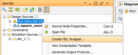 In the sources window, right-click on styx block design file and select “Create HDL Wrapper…”