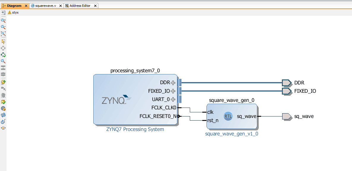 Connect Clock and Reset signals from Zynq block to Square Wave Module. Make the sq_wave port as an external port by right-clicking on it and selecting “Make External”. The resultant design should look like this: