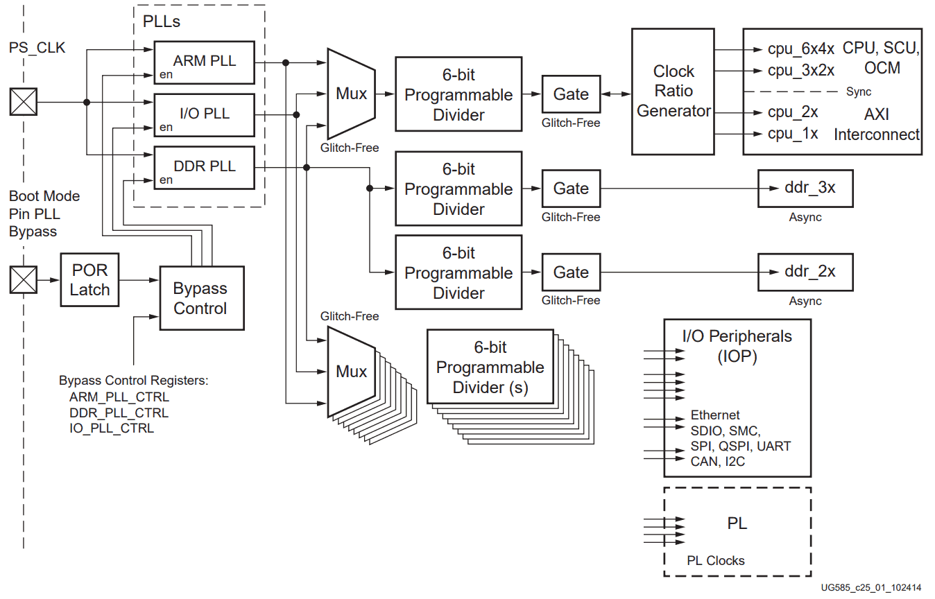 In the bottom right corner of the above image, you can see that Programmable Logic(PL, i.e the FPGA) section of the Zynq SoC has 4 clocks available from the clocking hardware. Each of these clocks has independent paths and are assumed to be totally asynchronous to each other. Each of these 4 clocks is sourced from either of the 3 PLLs, via a glitch-free multiplexer, and then pass through a 6-bit programmable frequency divider, and finally go into the PL section Zynq SoC.