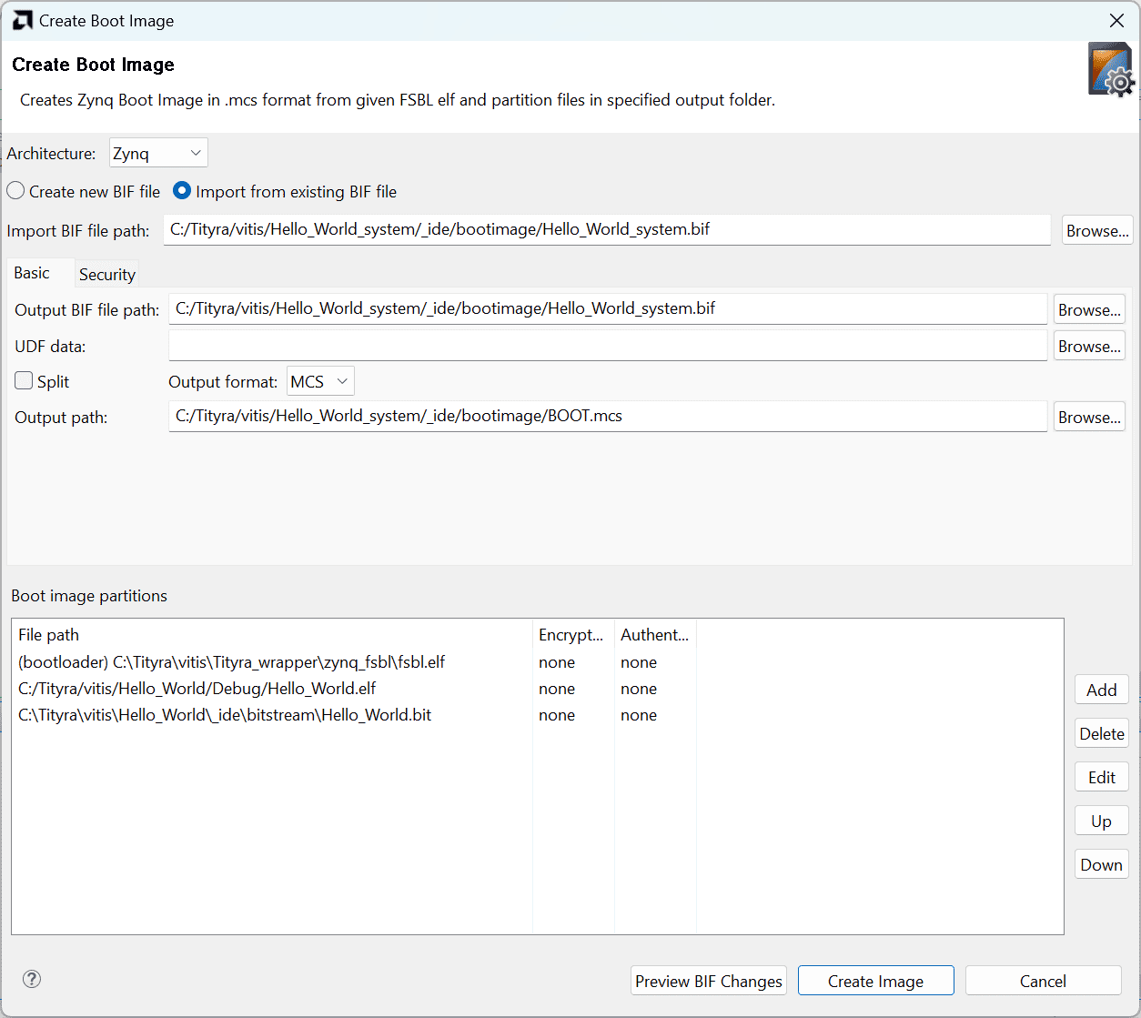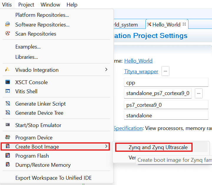 Select the ‘Hello_World’ in the Project Explorer, go to vitis -> Create Boot Image -> Zynq and Zynq Ultrascale. The tool automatically picks the files needed to create bootable image. If the files are not added automatically then add the following files manually.