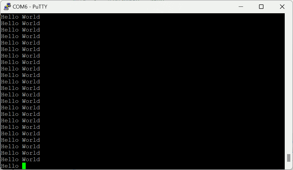 Open any serial terminal (such as PuTTY) and connect to the COM Port corresponding to Tityra at 115200 baudrate. If everything went well, Tityra should boot up from SD card and print “Hello World” repeatedly over USB-UART on the serial terminal application.