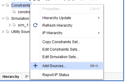 We have to add constraints for some ports in the design. Since we have BSP, most of the ports would be assigned from the BSP. We will have to manually assign for the rest of the ports. Right-click on “Constraints” in the Sources window, and select “Add Sources” as shown below.