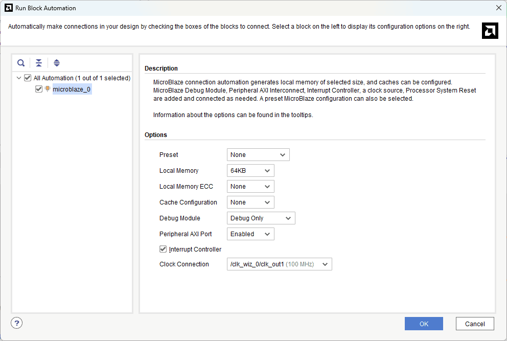 Click Run Block Automation with 64 KB of local memory and interrupt controller enabled.