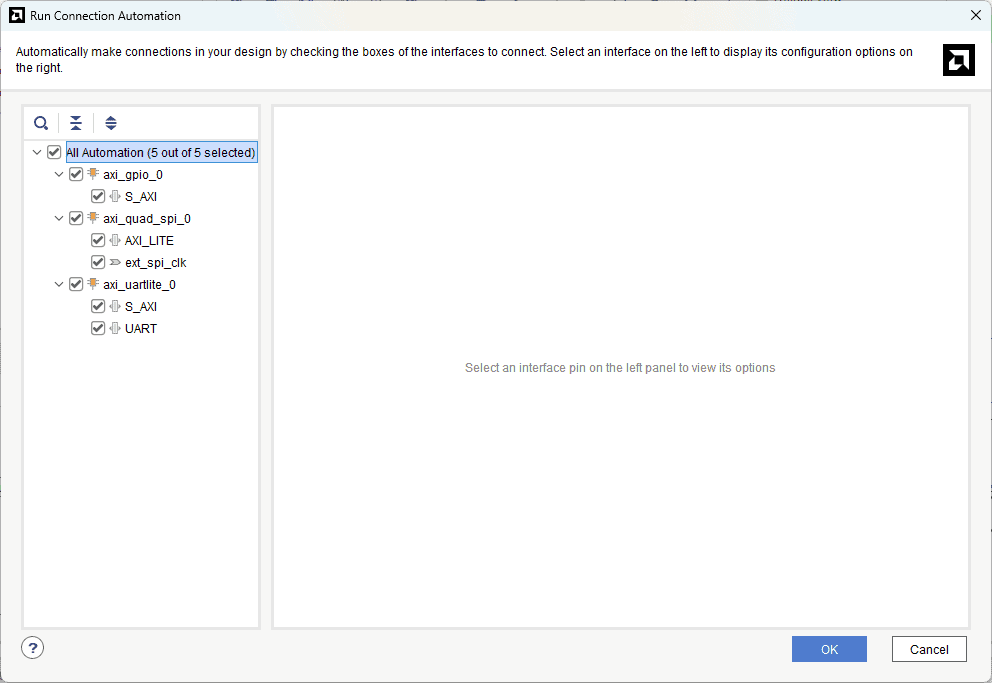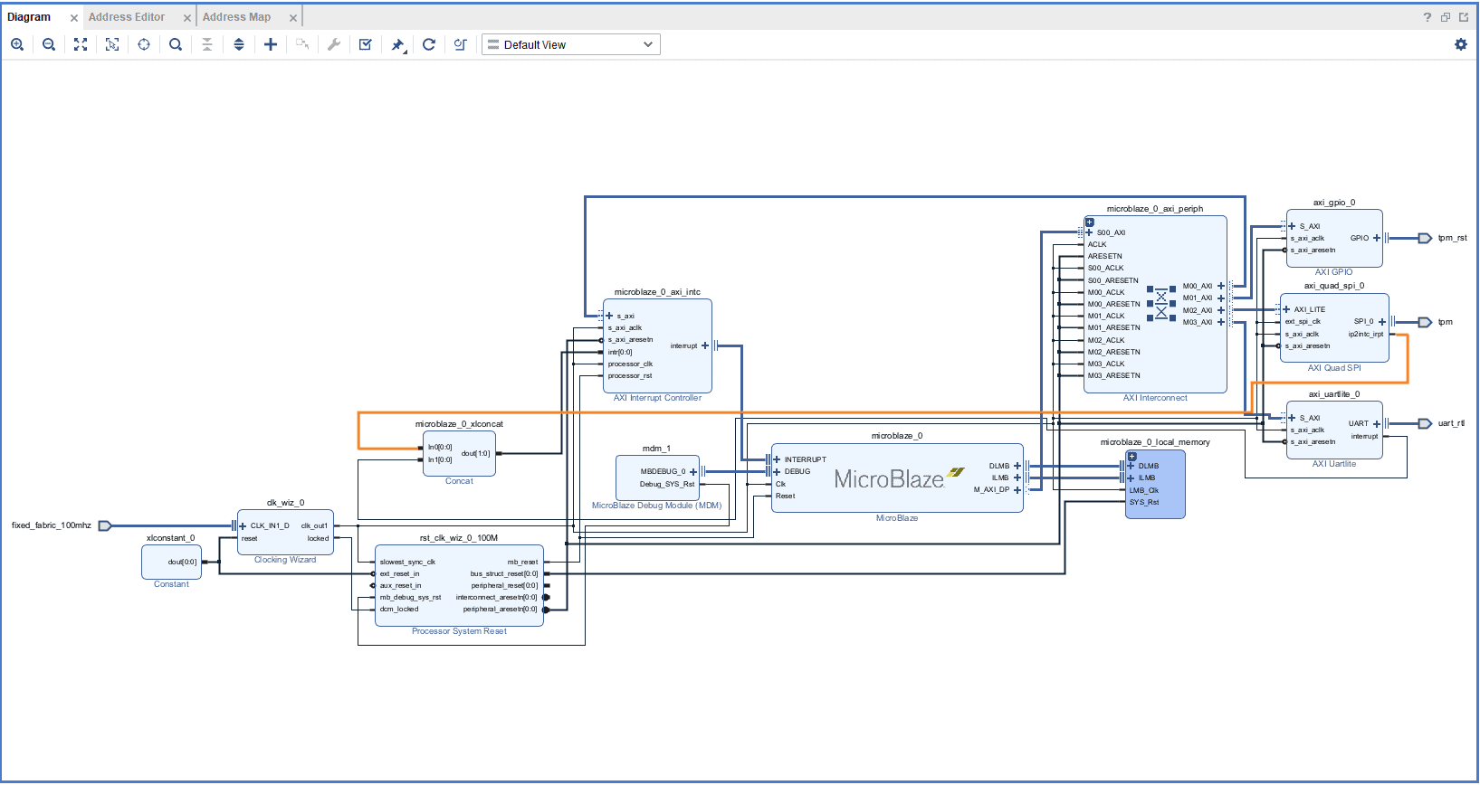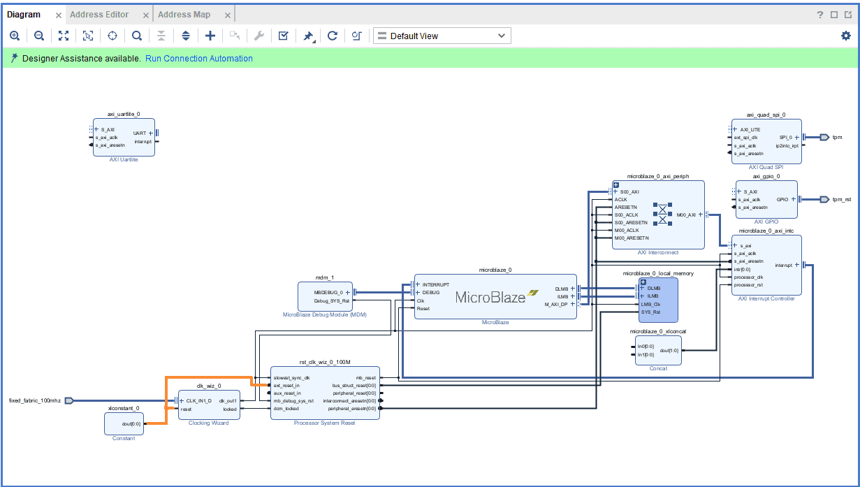 Connect the interrupts from axi_uartlite_0 and axi_quad_spi_0 to the Concat block as shown below (the order does not matter). Make sure that the final design looks similar to the image below.