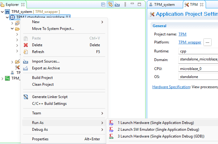 Right-click on the .elf file in the Project Explorer and select “Launch on Hardware” as shown below.