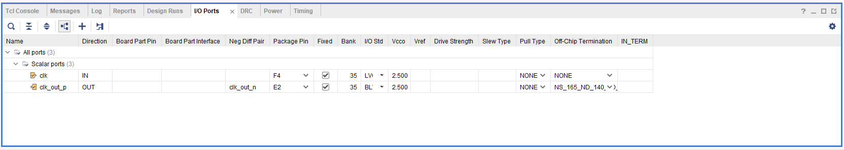After completing the implementation process, select the “Open Implementation Design” option. Within the design, go to the I/O Ports Tab and ensure accurate specification of the Package pin for both the input clock pin and the output clock pins.
