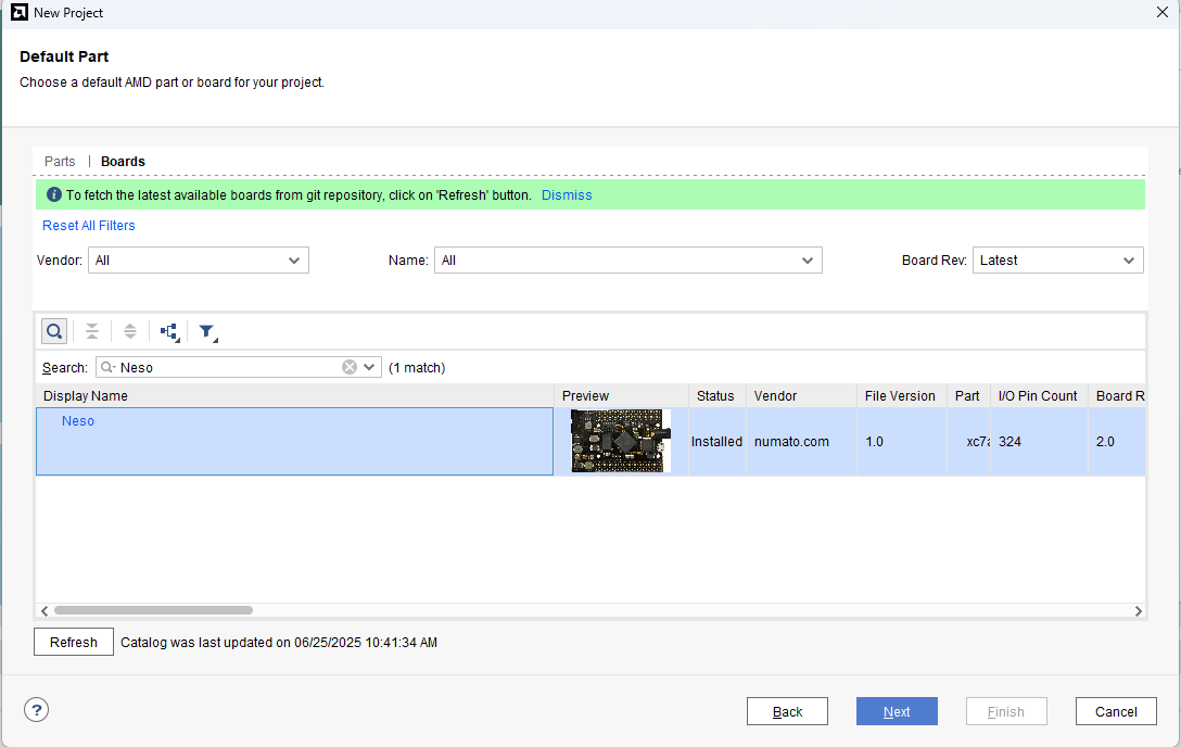 At the “Default Part” stage, switch to the “Boards” tab and set the vendor to numato.com. Select “Neso” and click Next.If the Neso board does not appear in the list, click “Refresh” to update the board catalog. Vivado will then download the latest board files, after which Neso will become available for selection.