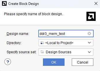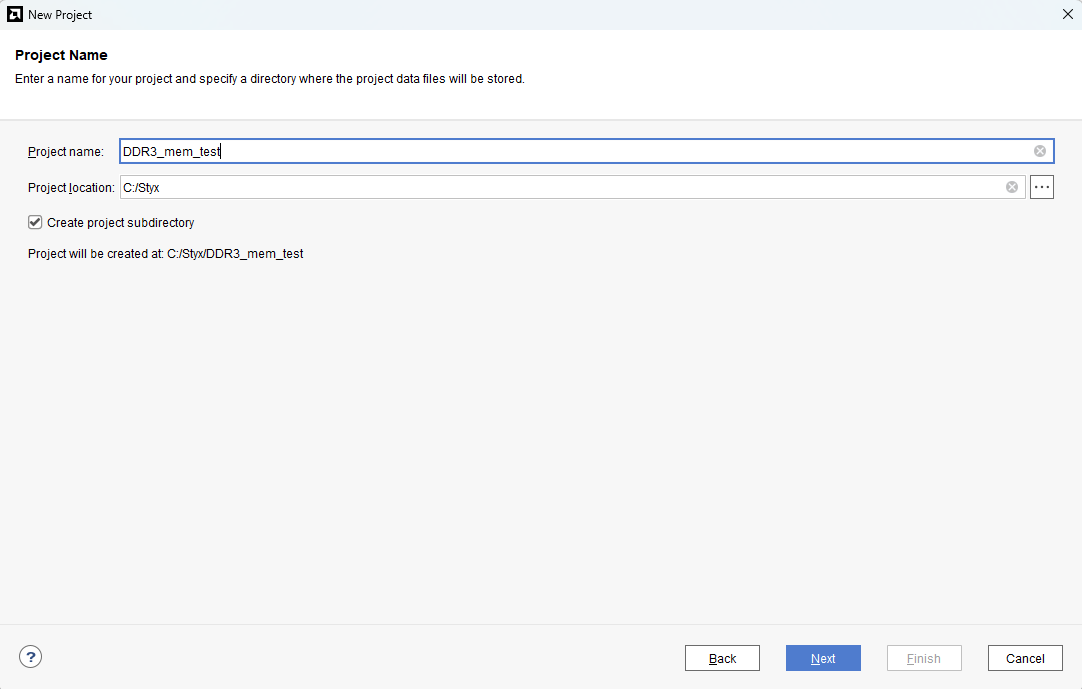 Type in a project name and save it at a convenient location. For this example “DDR3_mem_test” is used as project name, but feel free to use any name. Select the check box below to keep all project files in a single folder. The image below shows the settings for the example project. Click “Next” to continue.