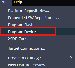 Once the build is complete successfully,program the FPGA on Styx Z7 with a simple boot loop program by selecting the Program Device option from the Vitis menu and power up Styx Zynq Module and connect AMD Platform USB cable and Micro USB cable for Serial debugging to the board. Make sure to configure channel A of the onboard FT2232H USB – Serial device as virtual communication using FT_Prog. The process is very similar to that of Saturn and details are available here. Change the Styx’s Boot Mode to JTAG. Please refer to user manual to learn more about configuring Styx’s Boot Mode.