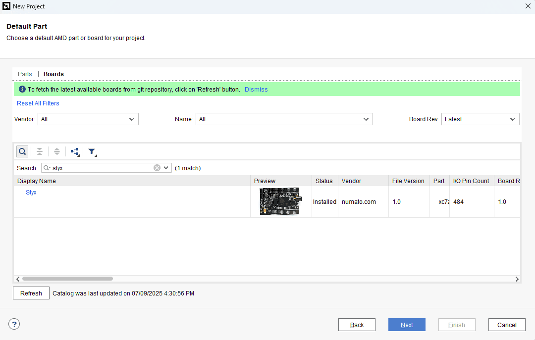 At the “Default Part” stage, switch to the “Boards” tab and set the vendor to numato.com. Select “Styx” and click Next.If the Styx board does not appear in the list, click “Refresh” to update the board catalog. Vivado will then download the latest board files, after which Styx will become available for selection.