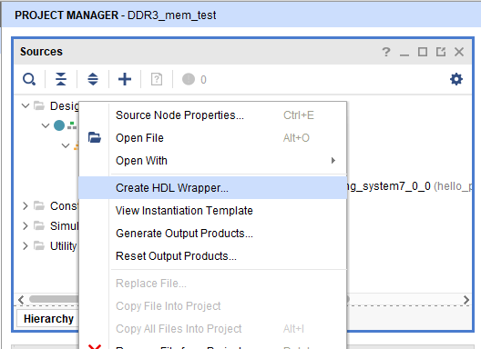 Go to “Sources” tab, right click on “styx” design file and select “Create HDL Wrapper”. Click OK on the window that appears to finish generating wrapper.