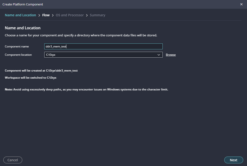 Give the component name and the platform location and click on “Next”.