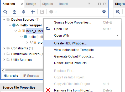Go to “Sources” tab, right click on “styx” design file and select “Create HDL Wrapper”. Click OK on the window that appears to finish generating wrapper.