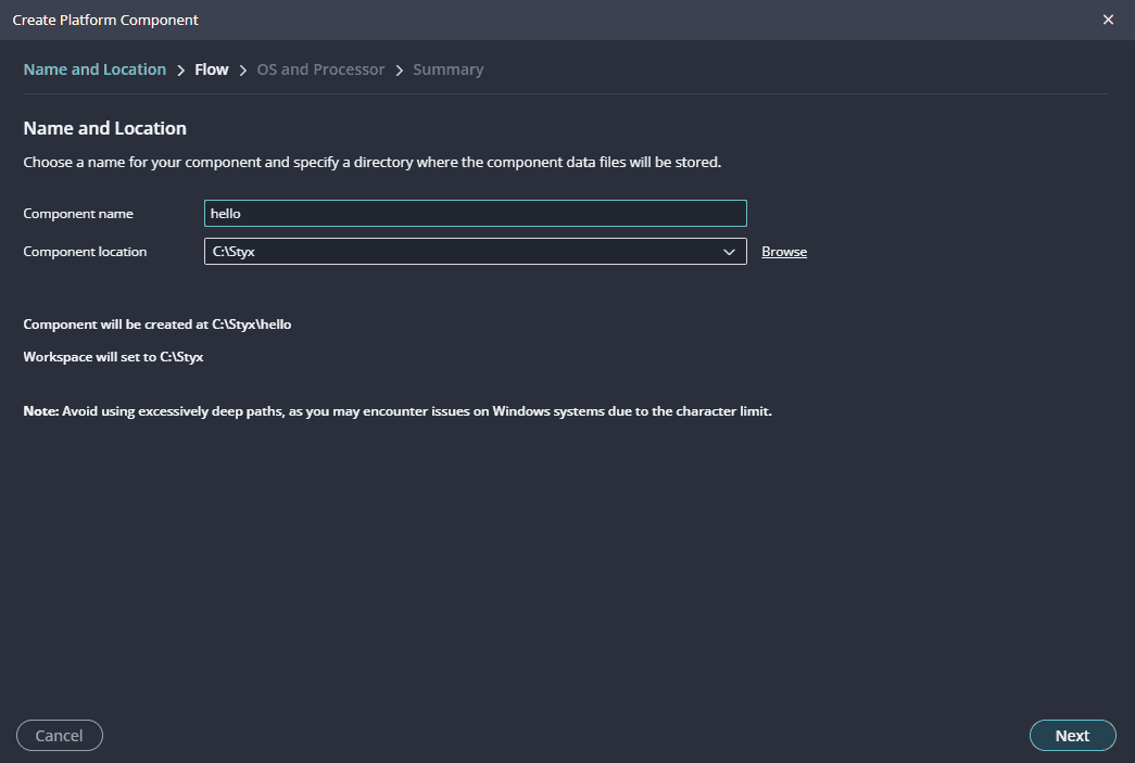 In “Create Application Component” tab specify project name and location, click “Next”.