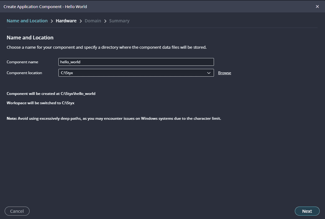 Type in a project name and save it at a convenient location. For this example “Hello_world” is used as project name, but feel free to use any name. Select the check box below to keep all project files in a single folder. The image below shows the settings for the example project. Click “Next” to continue.