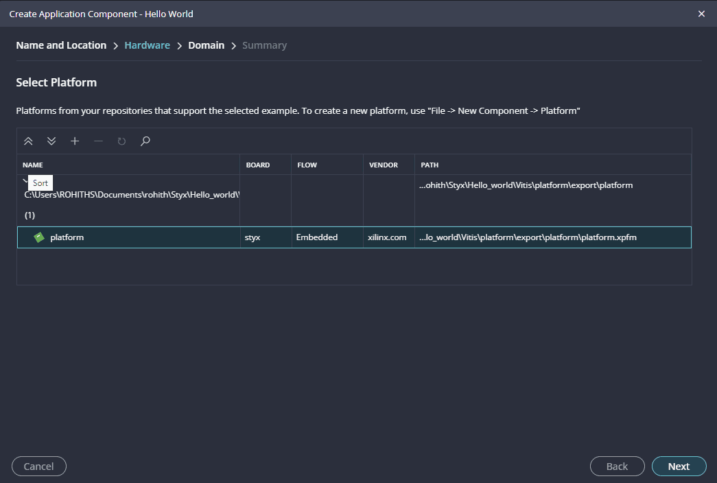 In the next tab browse the XSA file , select it , click on “Next”. In the next OS and Processor tab click “Next” and “Finish”.