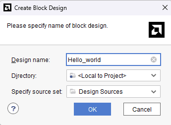 Under Flow Navigator, select “Create Block Design” in IP Integrator. Give an appropriate name to design. We will call it “Hello_world” for example.