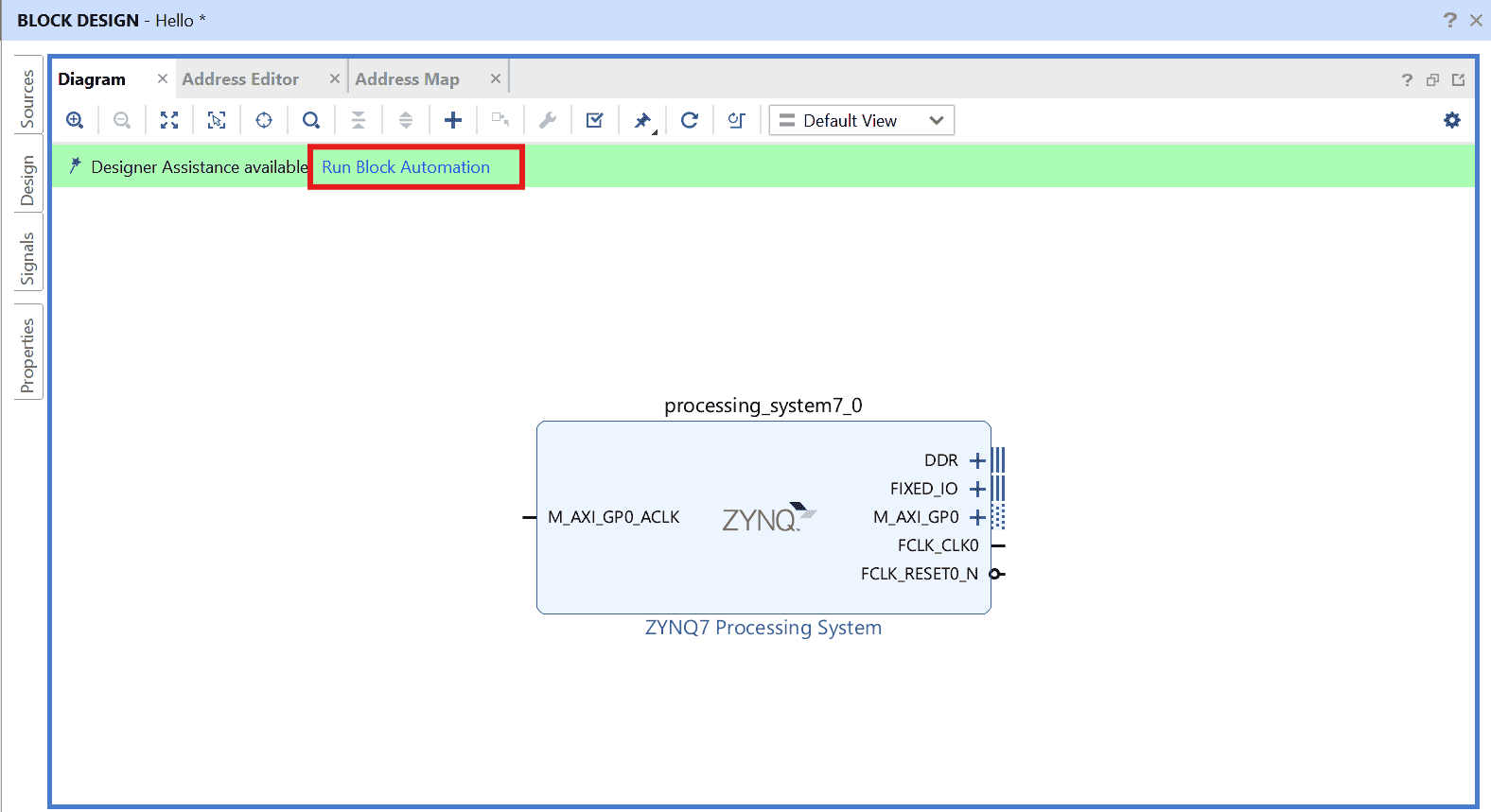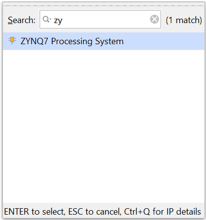 Go to Diagram window, right click and select “Add IP” from the popup menu. Search for ZYNQ7 Processing System. Add it to block design by double clicking.