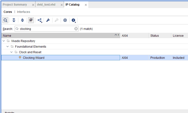 dvid_test: In this module, a “Clocking Wizard” IP core is instantiated to generate required clocks for VGA and DVI-D. A 100MHz clock from the onboard oscillator is provided as input, and following clocks are derived from it: