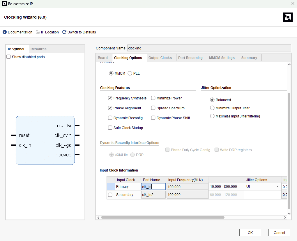 In ‘Clocking Options’ tab, rename primary clock port name as ‘clk_in’.
