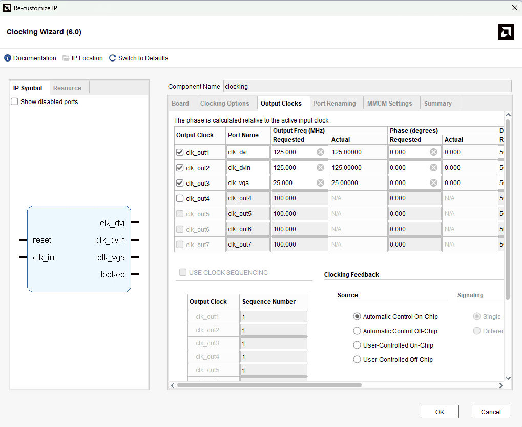 clk_vga: 25MHz clock. This is the pixel clock frequency for 640×480@60Hz VGA resolution.clk_dvi&clk_dvin: 125 MHz clocks.clk_dvinis 180 degrees out of phase toclk_dvi. These clocks are used for serialization using ODDR2.