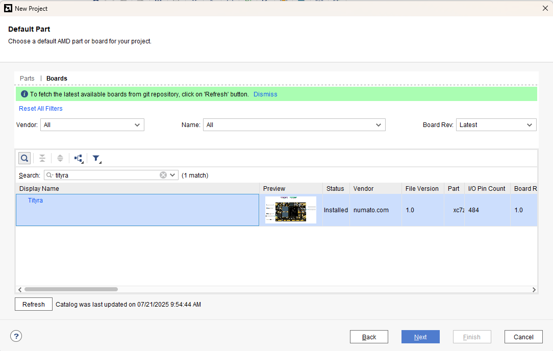 At the “Default Part” stage, switch to the “Boards” tab and set the vendor to numato.com. Select “Tityra” and click Next.If the Tityra board does not appear in the list, click “Refresh” to update the board catalog. Vivado will then download the latest board files, after which Tityra will become available for selection.