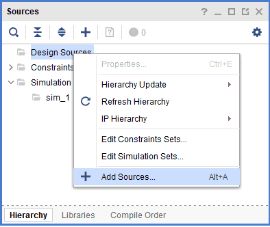 In the “Sources” tab, right-click on the “Design Sources” and select “Add Sources”. It will open a new “Add Sources” window.