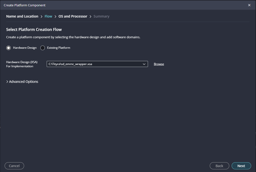 Launch Vitis IDE and create a new platform for the project, by selecting “Create Platform Component”, click “Next”, in the Flow tab select the XSA file saved using the step 15 and finally click “Next” and “Finish” respectively.