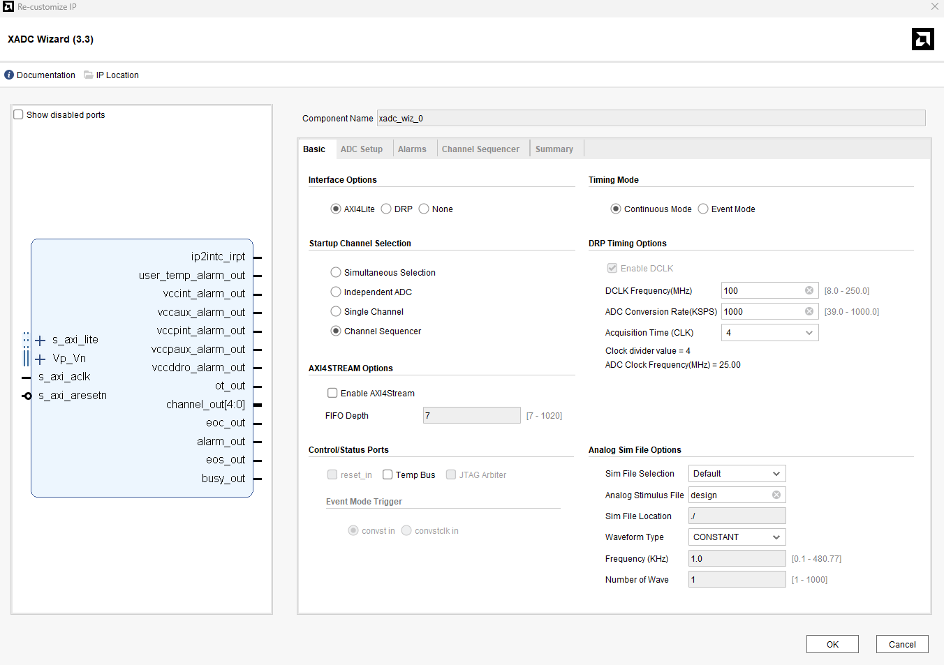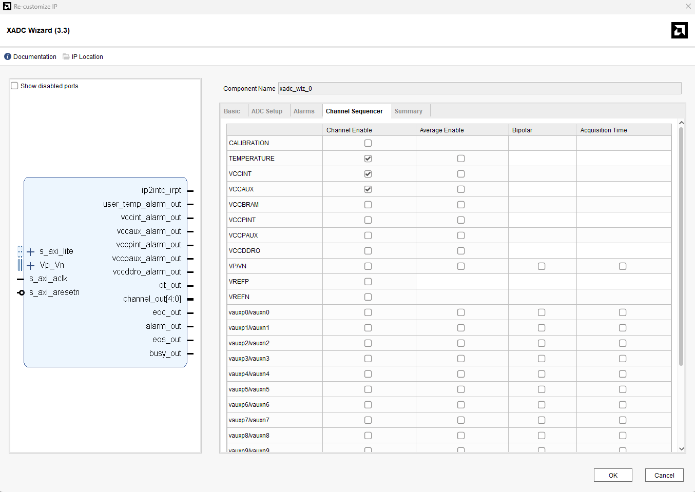Double click on XADC Wizard IP to customize it , and in the ‘Basic’ tab select the ‘Startup channel Selection’ as ‘Channel Sequencer’.