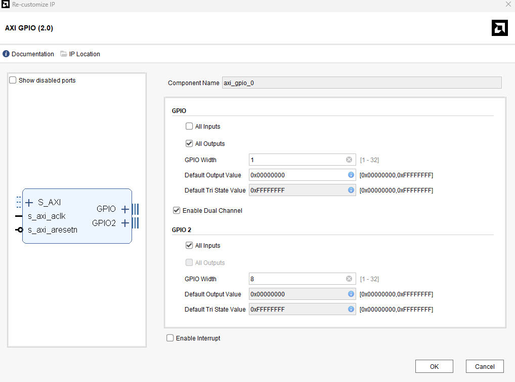 Next double click on AXI GPIO IP to customize it. Make the changes as per the image below.