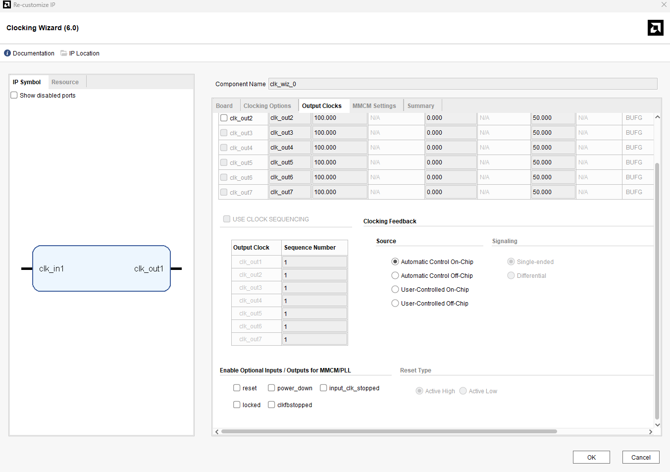 Next customize the clocking wizard IP by double clicking on the ip and disable the ‘reset’ and ‘locked’, and make sure the output clock is 100MHz ‘Output Clocks’ tab.