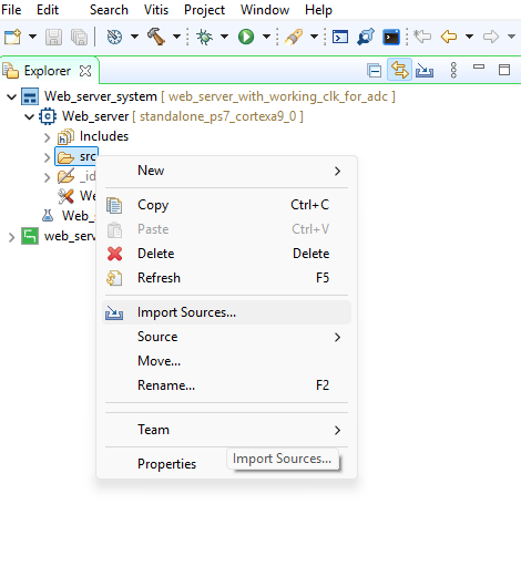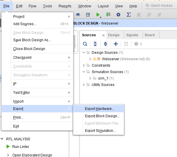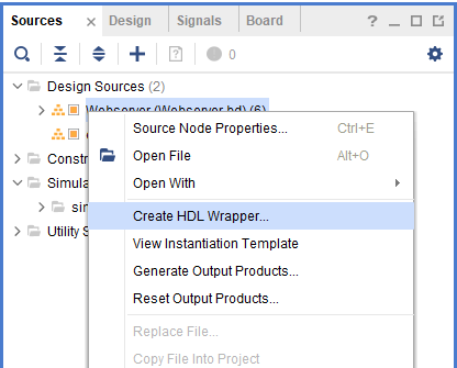 Go to âSourcesâ tab, right click on âWebserverâ design file and select âCreate HDL Wrapperâ. Click OK on the window that appears to finish generating wrapper.