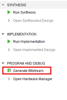 Click âGenerate Bitstreamâ under PROGRAM AND DEBUG section and click âYesâ in any subsequent dialog window which comes up.