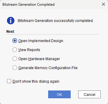 Once the bitstream is successfully generated, close any âBitstream Generation Completedâ dialog which comes up asking for what to do next.