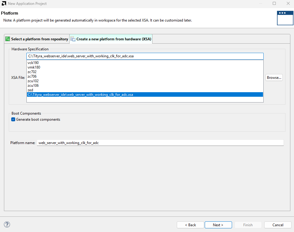 In the Platform window, select Create a new platform from hardware tab and import the XSA file which is already created (Provide XSA file location). Click Next.