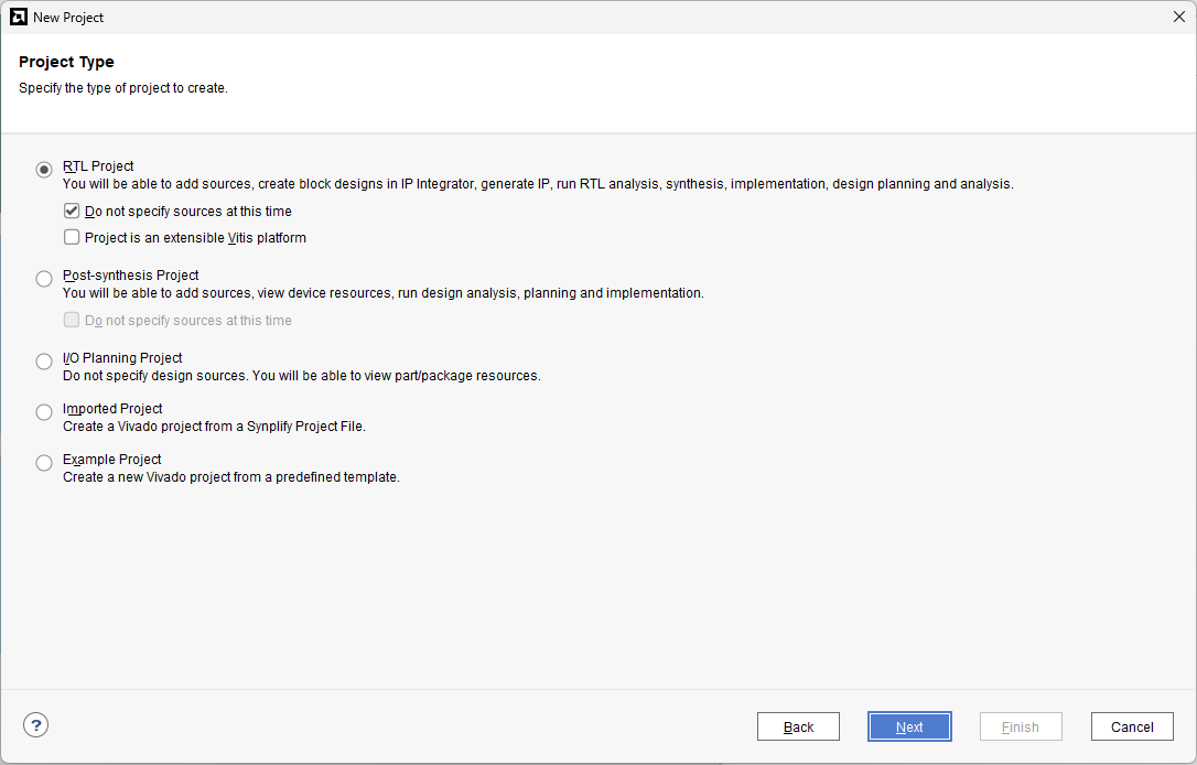Choose âRTL Projectâ as project type and check the option âDo not specify sources at this timeâ.