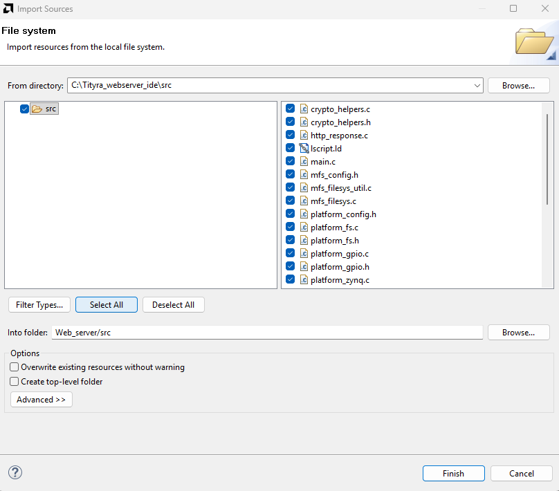 Click âSelect Allâ, verify that all source files appear in the right-side panel, and then click Finish to complete the import.