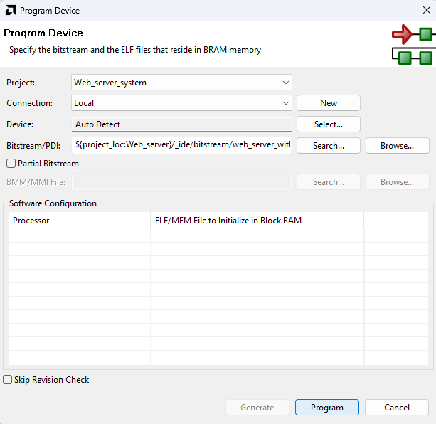 Program the FPGA on Tityra with the generated bitstream and simple bootloop firmware by selecting the âProgram Deviceâ option from the âVitisâ menu.
