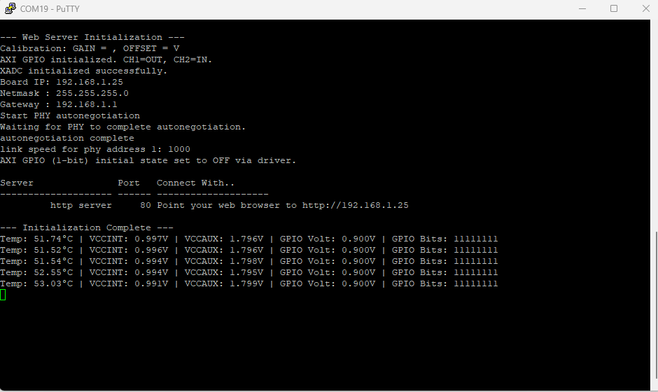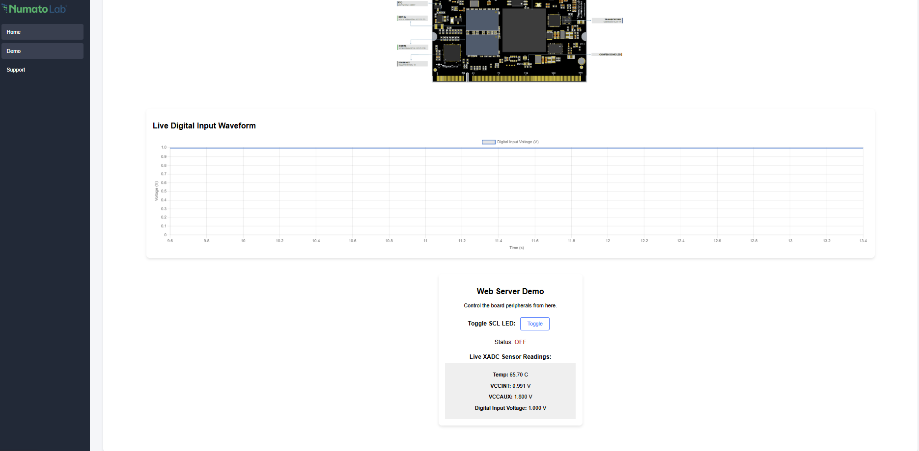 - đ Live Digital Input Waveform Acquisition: The core feature utilizes the Processing System (PS) to achieve precise, high-frequency data sampling from the PL-side AXI GPIO. This raw digital input is streamed to the browser via JSON and rendered as a live, scrolling waveform using the Chart.js library, effectively turning the Zynq into a remote oscilloscope.