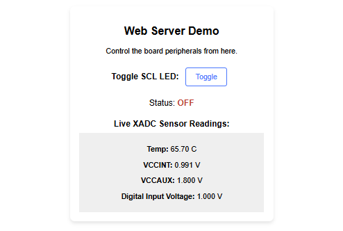 - Web Action: The website automatically asks the Zynq for this data once every second via the /xadc endpoint.
