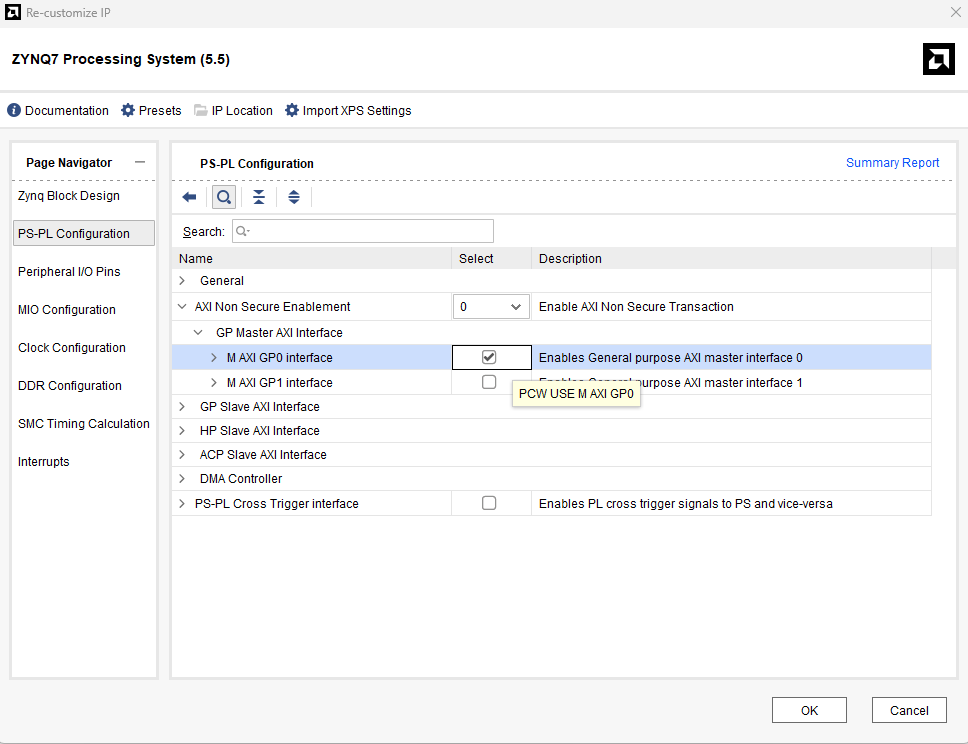 Enable the M AXI GP0 interface, and click OK to close the configuration window.