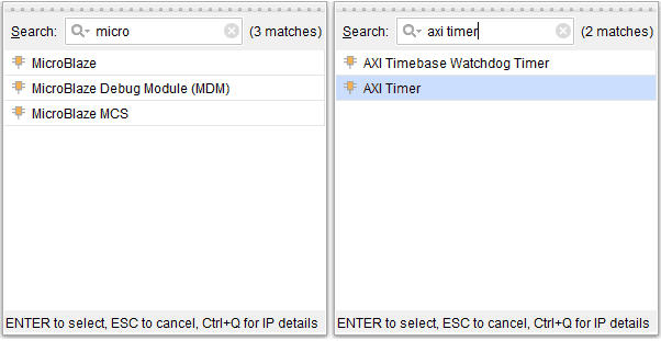 Add “System Clock“, “DDR3 SDRAM” and “USB UART” to the design by double-clicking the corresponding peripherals. In the “Diagram” window, right-click and select “Add IP” from the popup menu. Search for “MicroBlaze” & “AXI Timer” and add them to the design by double-clicking them.