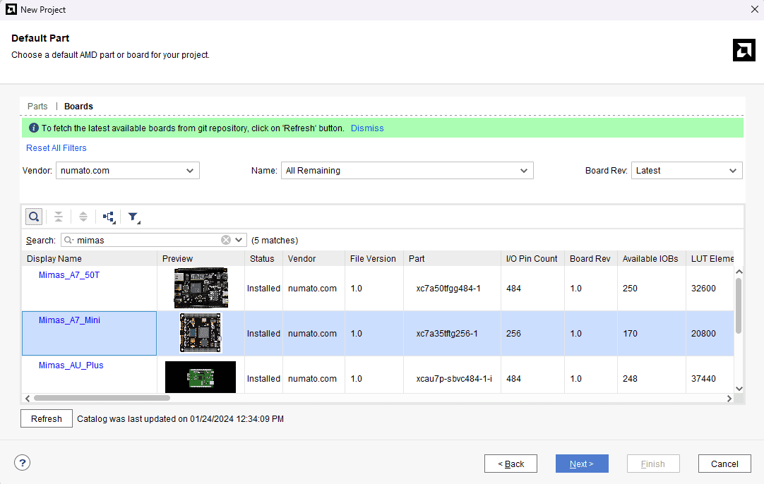 At the “Default Part” wizard, select “Boards” and then select “Mimas_A7_Mini” board. Click “Next” to continue. If Mimas_A7_Mini is not displayed in the Boards list, you need to install Mimas_A7_Mini board support files appropriately and retry this step. You can download Mimas A7 Mini board support files for Vivado here. Follow the readme in the link on how to install the Vivado board files in your system.