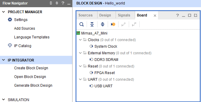 In the “Flow Navigator” panel, select “Create Block Design” under the IP integrator section. Give an appropriate name (Eg: “Hello_world_design“) to the design and click “OK“. Select “Board” in the “Block Design” block. The default peripherals available for Mimas A7 Mini Board will be displayed.