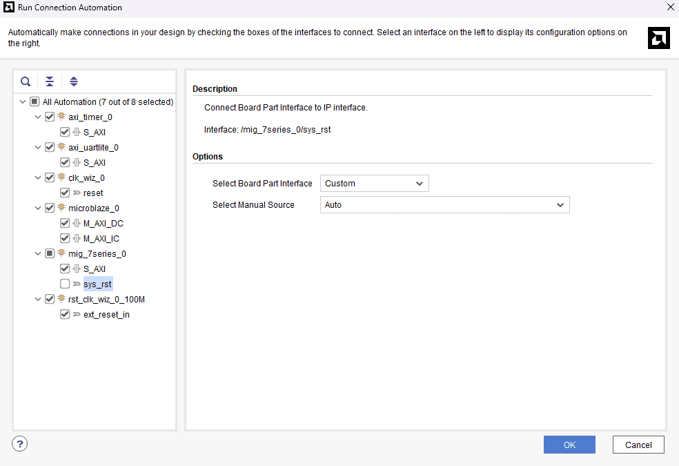 Run “Connection Automation” and select all the pins except “sys_rst” in “mig_7series_0“.