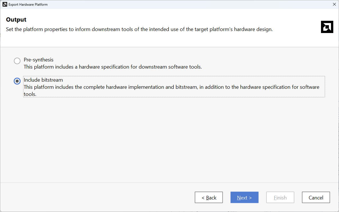After generating the bitstream successfully, select Export -> Export Hardware from the File menu. Click Next.