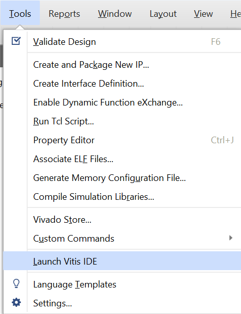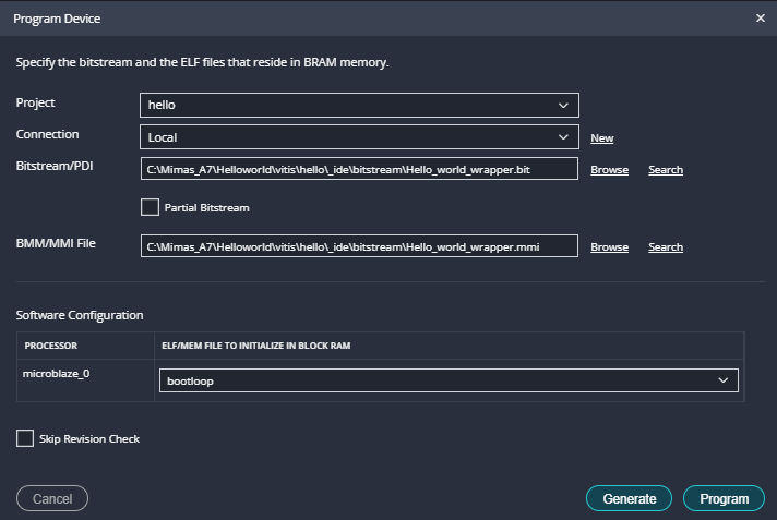 Program the FPGA on Mimas A7 with a simple boot loop program by selecting the Program Device option from the Vitis menu.