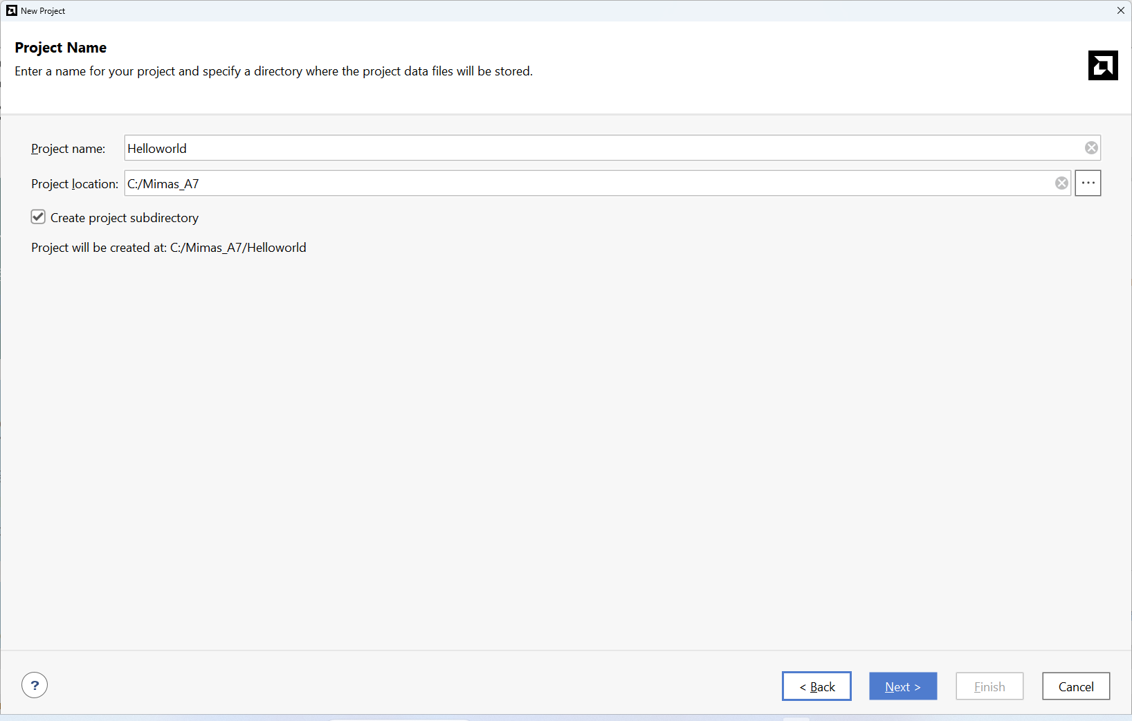 Enter a name for the project and save it at a suitable location. Check the option “Create project subdirectory”. Click Next to continue.
