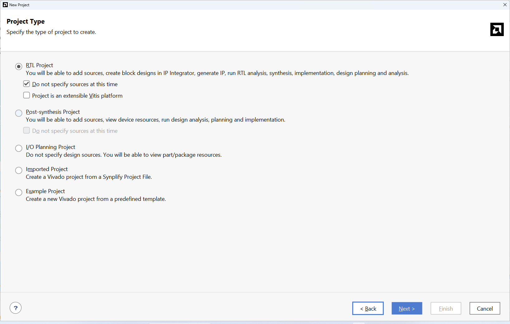 In the Project Type window, select RTL Project and check the option “Do not specify sources at this time”. Click Next.